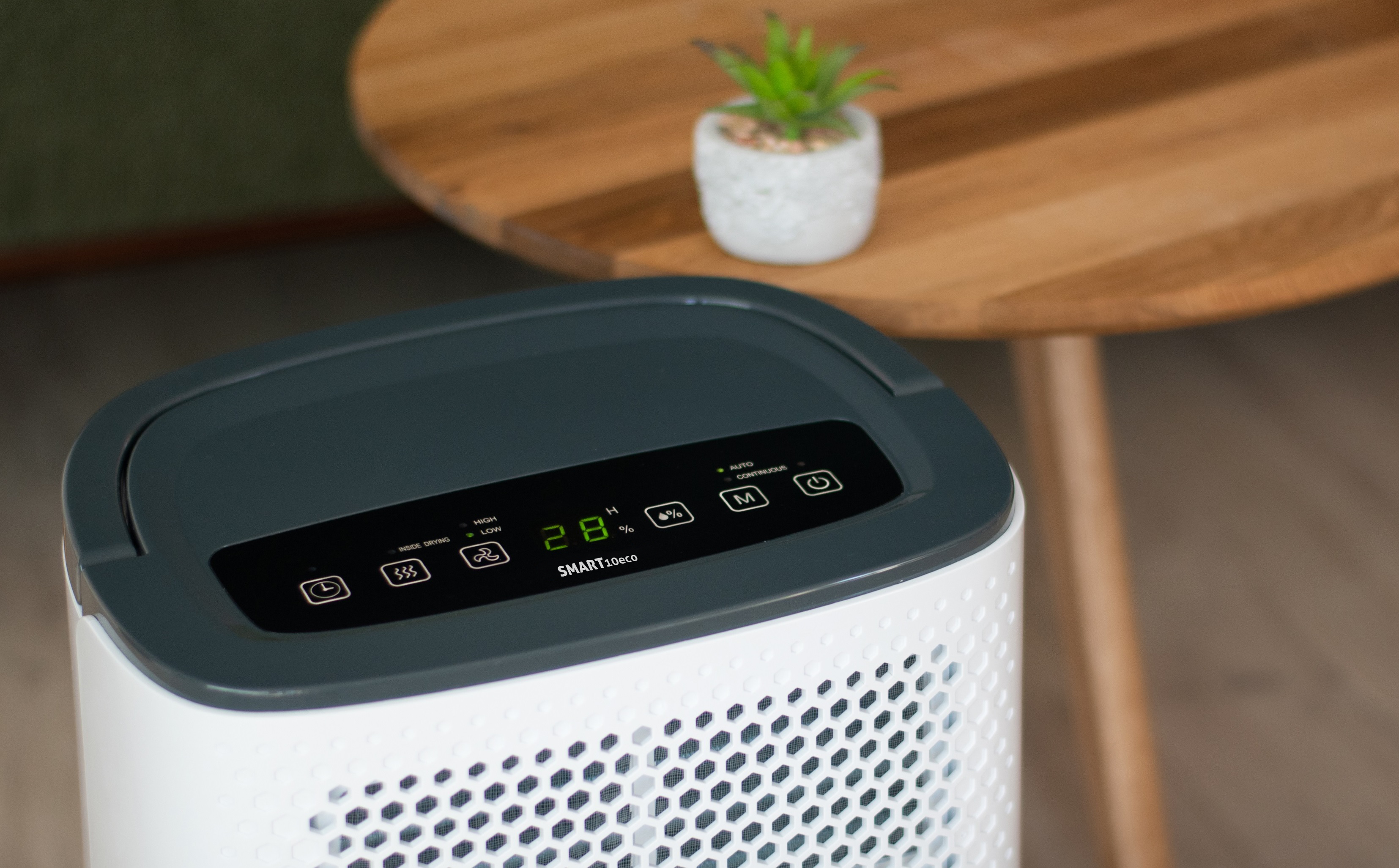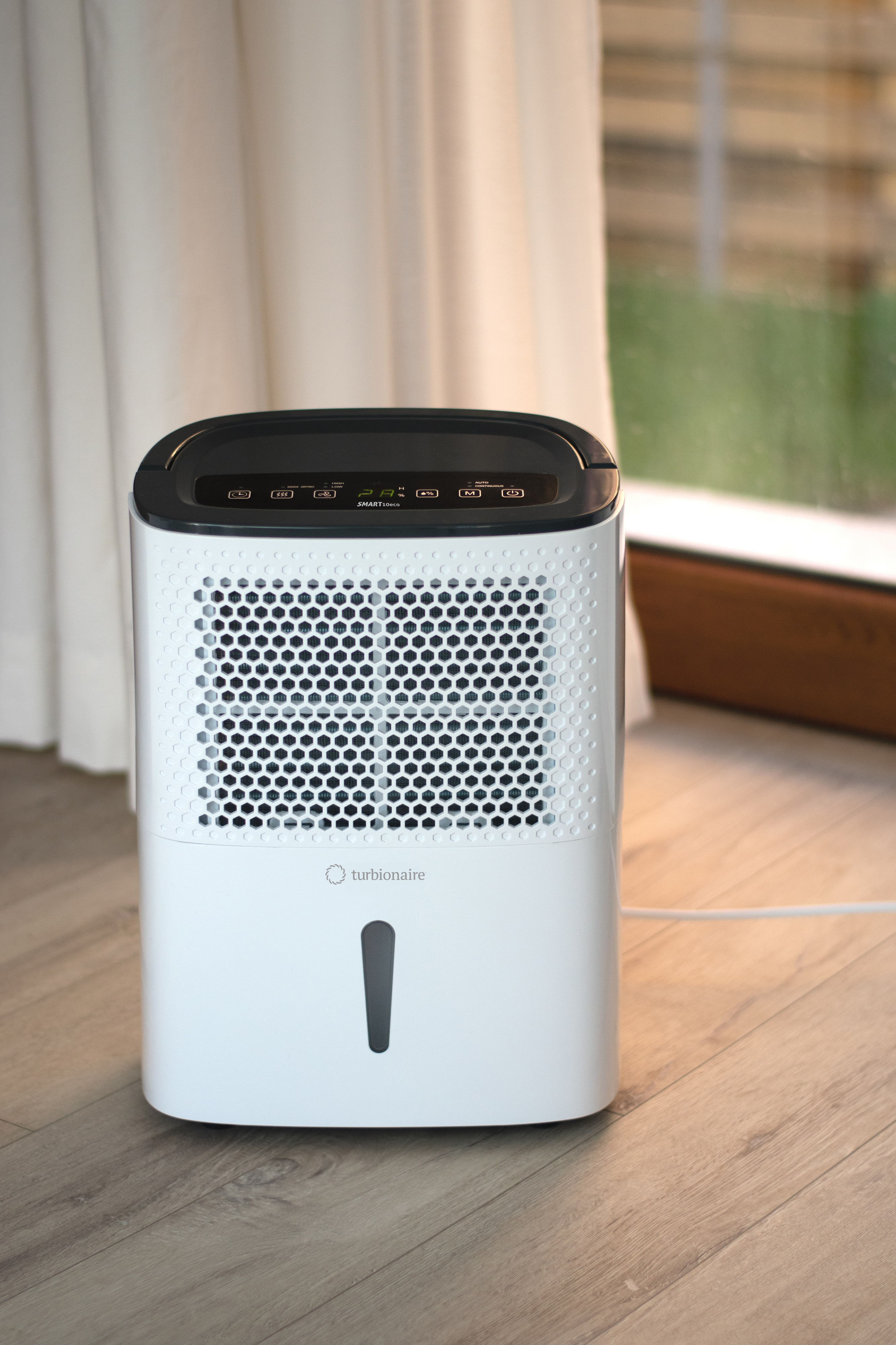 Turbionaire SMART 10 ECO Luftentfeuchter sorgt rasch und effektiv für eine gesunde Luftfeuchtigkeit bei Ihnen daheim oder im Büro. Ein kompakter und geräuscharmer Kondensations-Entfeuchter mit einer Entfeuchtungskapazität bis zu 10 Liter Wasser pro Tag in Räumen bis 40 m². Die Bedienung des SMART erfolgt über das intuitive digitale Soft-Touch-Bedienfeld an der Oberseite des Gerätes und es zeigt auch die eingestellte / aktuelle Luftfeuchtigkeit an.